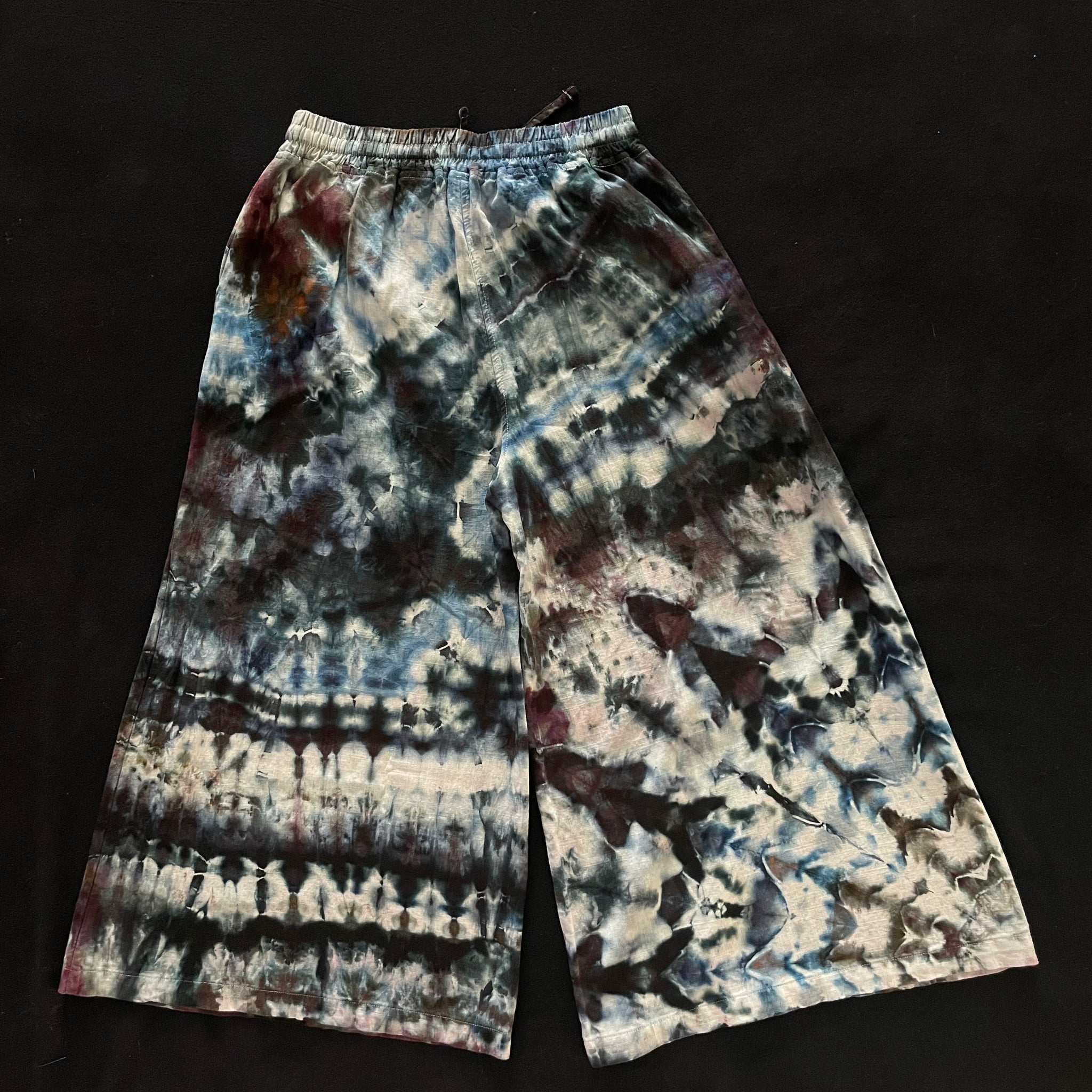 Slipknot Tie Dyes 50% linen 50% rayon lightweight wide leg Capri Palazzo pants with pockets. Drawstring and elastic waist. Runs true to size